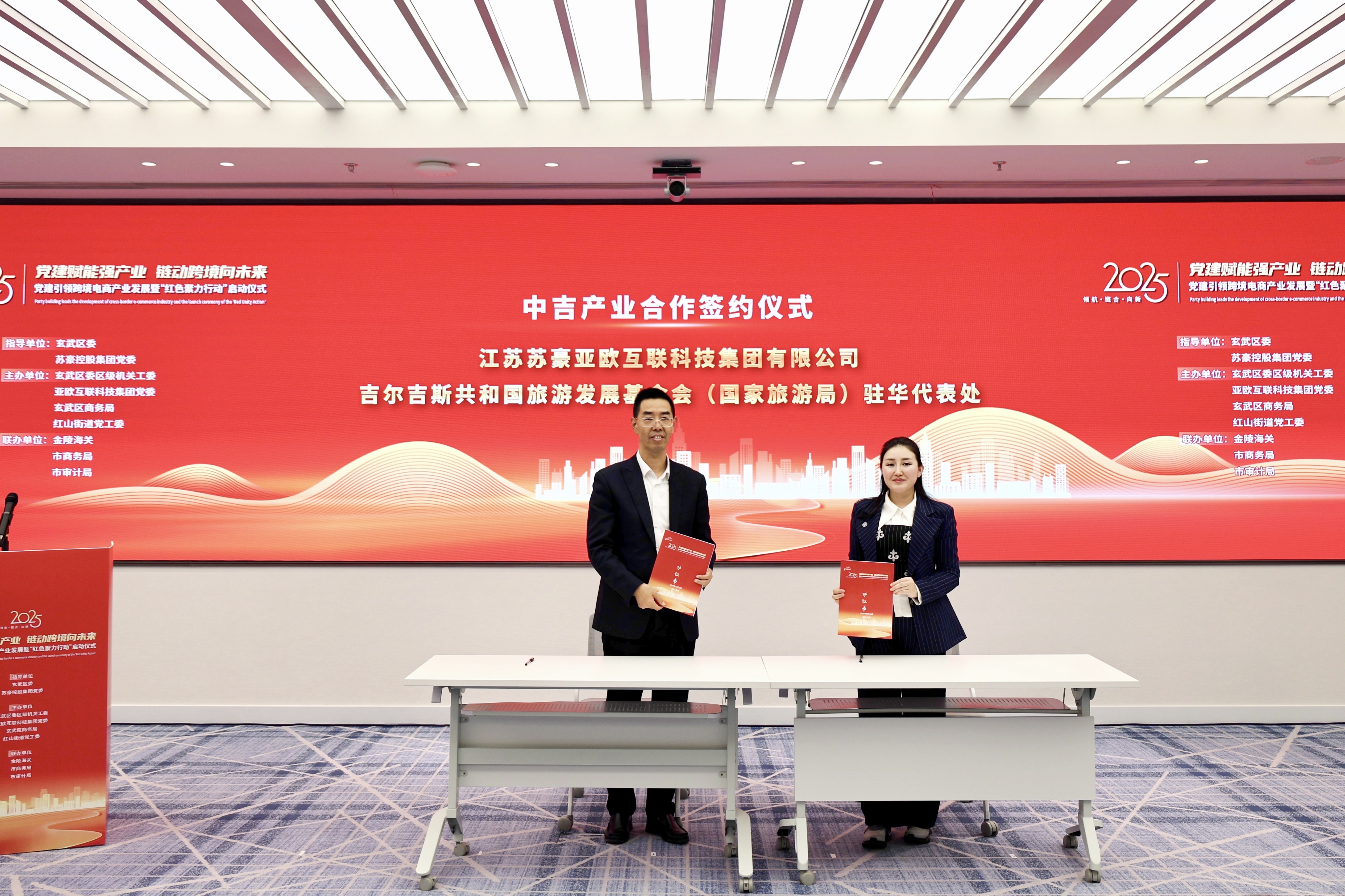 活動現場,江蘇蘇豪亞歐互聯科技集團有限公司與吉爾吉斯共和國旅游發(fā)展基金會駐華代表處簽署中吉產業(yè)合作協議,標志著雙方跨境產業(yè)協作進入新階段。同時,蘇貿環(huán)亞(江蘇)進出口有限公司、中國郵政集團有限公司南京市分公司、南京金箔集團寶玉工藝有限公司3家企業(yè)正式簽約入駐中國-中亞貿易暢通合作平臺,攜手共拓跨境業(yè)務版圖,為平臺發(fā)展注入新力量。