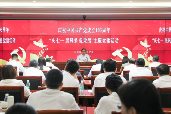 為慶祝中國共產(chǎn)黨成立103周年,回顧黨的光輝歷程,謳歌黨的豐功偉績,弘揚(yáng)偉大建黨精神,凝聚昂揚(yáng)奮進(jìn)力量,7月1日,蘇豪控股集團(tuán)黨委舉辦“慶七一 展風(fēng)采 促發(fā)展”主題黨建活動。集團(tuán)黨委書記、董事長周勇出席活動并講話,集團(tuán)黨委班子成員參加活動。紅心向黨,星耀征程?;顒又?,與會人員首先集體參觀了集團(tuán)優(yōu)秀星級黨支部風(fēng)采展示。以黨支部評星定級工作為基礎(chǔ),風(fēng)采展集中展示了集團(tuán)2023年度6家五星級黨支部和18家四星級黨支部的黨建工作成果,通過搭建互學(xué)互鑒平臺,進(jìn)一步強(qiáng)化示范帶動作用,激勵廣大基層黨組織奮發(fā)進(jìn)取、爭先創(chuàng)